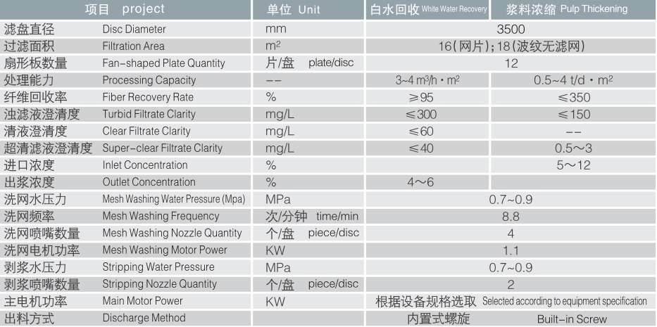 框架軸盤式過濾機過濾圓盤由若干片大小相同,面積相等的扇形板組合而成,扇形板懸掛安裝于過濾機的框架主軸上,設備運轉(zhuǎn)時每一片進入過濾狀態(tài)的扇形板濾液出口都處于最低位置。在工作過程中,隨著主軸的運轉(zhuǎn),紙漿懸浮液通過進漿槽進入槽體,當扇形板沒入液面以下時,扇形板內(nèi)外存在液位差,在液位差的作用下,漿料中的水通過覆在扇形板外面的濾網(wǎng)進入扇形板內(nèi),經(jīng)空心轉(zhuǎn)子臂濾液通道分別流向槽體兩端的濁濾液區(qū)、清濾液區(qū)及超清濾液區(qū),再通過各區(qū)相應的管道流出,漿料則被濾網(wǎng)攔截,實現(xiàn)漿水分離。扇形板轉(zhuǎn)出液面時,液位差形成的抽吸作用并沒有立刻消失,仍使濾網(wǎng)上的漿層繼續(xù)脫水,濃度繼續(xù)增大。主軸繼續(xù)轉(zhuǎn)動,液位差形成的抽吸作用消失,扇形板進入剝漿區(qū)。扇形板上的漿層在重力和剝漿噴嘴噴出的扇形水流雙重作用下脫落,通過兩相鄰扇形板盤之間的空間,在沒有任何阻礙下,進入位于由框架主軸和扇形板形成的寬闊的內(nèi)部空間漿料收集槽中,通過螺旋輸送機輸送到接料管道中。當濾盤轉(zhuǎn)動到洗網(wǎng)區(qū)時,由擺動的洗網(wǎng)噴嘴噴水洗網(wǎng)、恢復過濾能力后進入下一個過濾周期。隨著濾盤不斷的轉(zhuǎn)動,扇形板就處在不同的區(qū)間,產(chǎn)生連續(xù)的過濾作用。